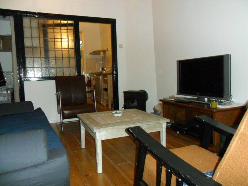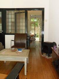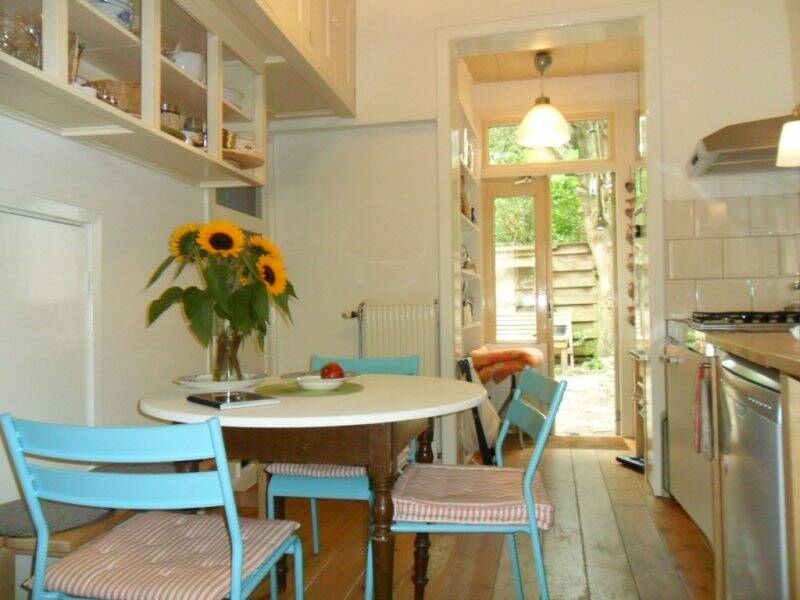 On the ground floor there is a living room, kitchen and bathroom with bath and shower. There is a small quiet city garden accessible via the kitchen and an alley next to the house. On the first floor are two bedrooms, one with a small balcony overlooking the backyard.